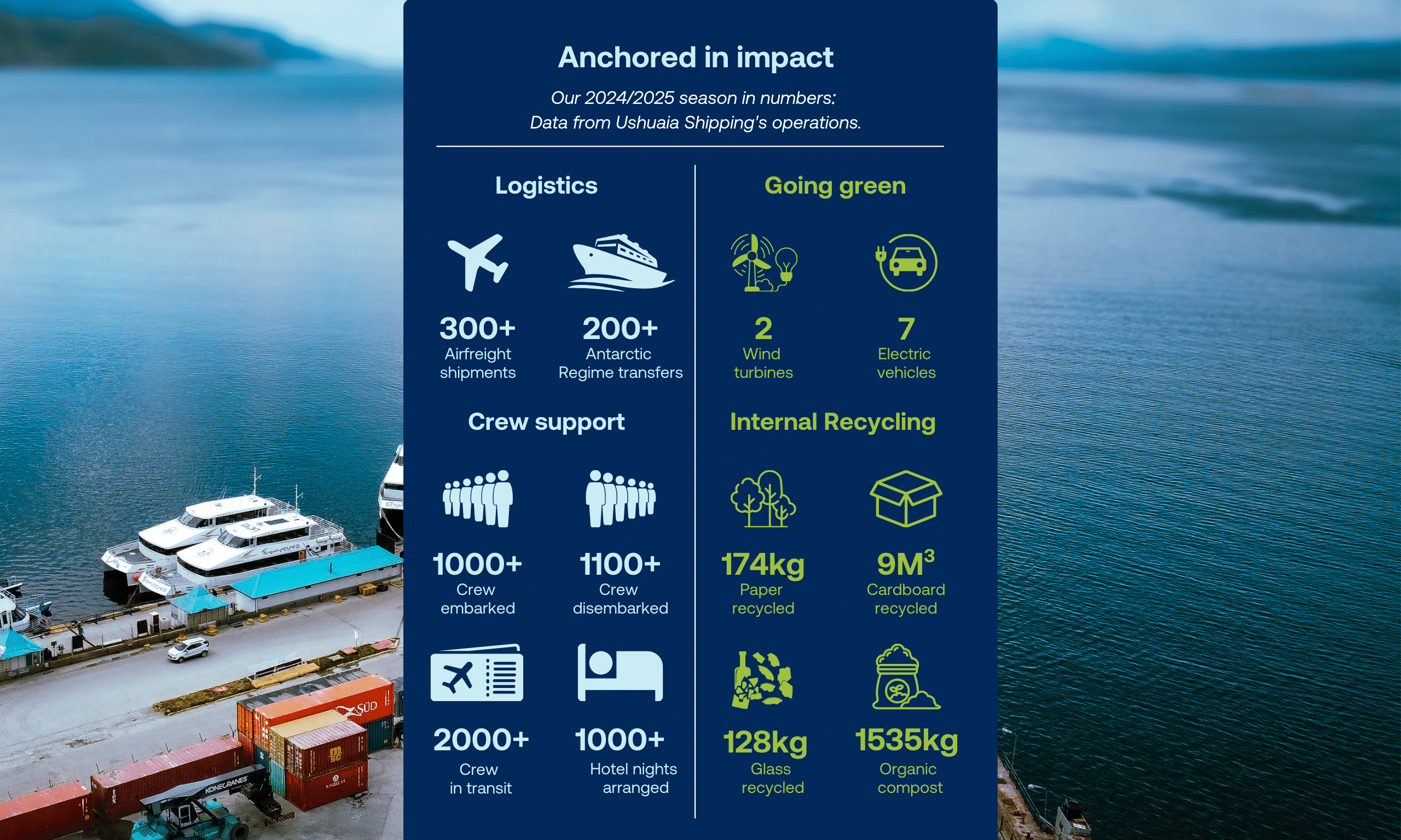 From October 2024 to January 2025, Ushuaia Shipping proudly led the way with Ushuaia’s first-ever solid waste recycling program for expedition ships and superyachts. With your vessels participating, we created a new benchmark for environmental responsibility in Antarctica’s gateway. This milestone marks not only a first for Ushuaia, but a first for the region. Your collaboration turned your ships into sustainability leaders.